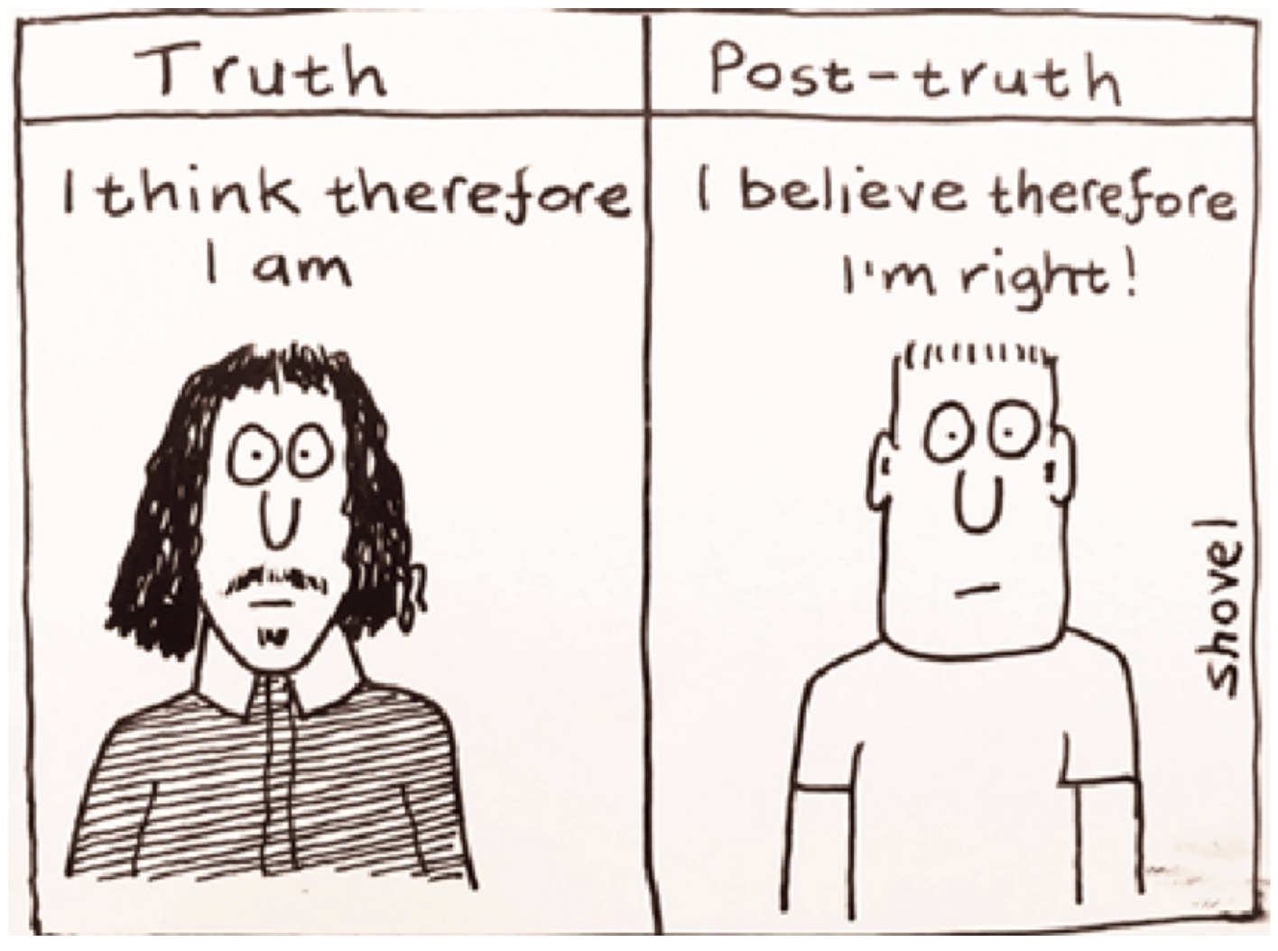La post-vérité est définie comme le moment où les faits objectifs ont moins d’influence que les émotions et les croyances personnelles dans la formation d’une opinion. En somme, ce qui est établi, considéré comme un élément objectif (“il pleut”) a moins d’importance que ce que vous en pensez.